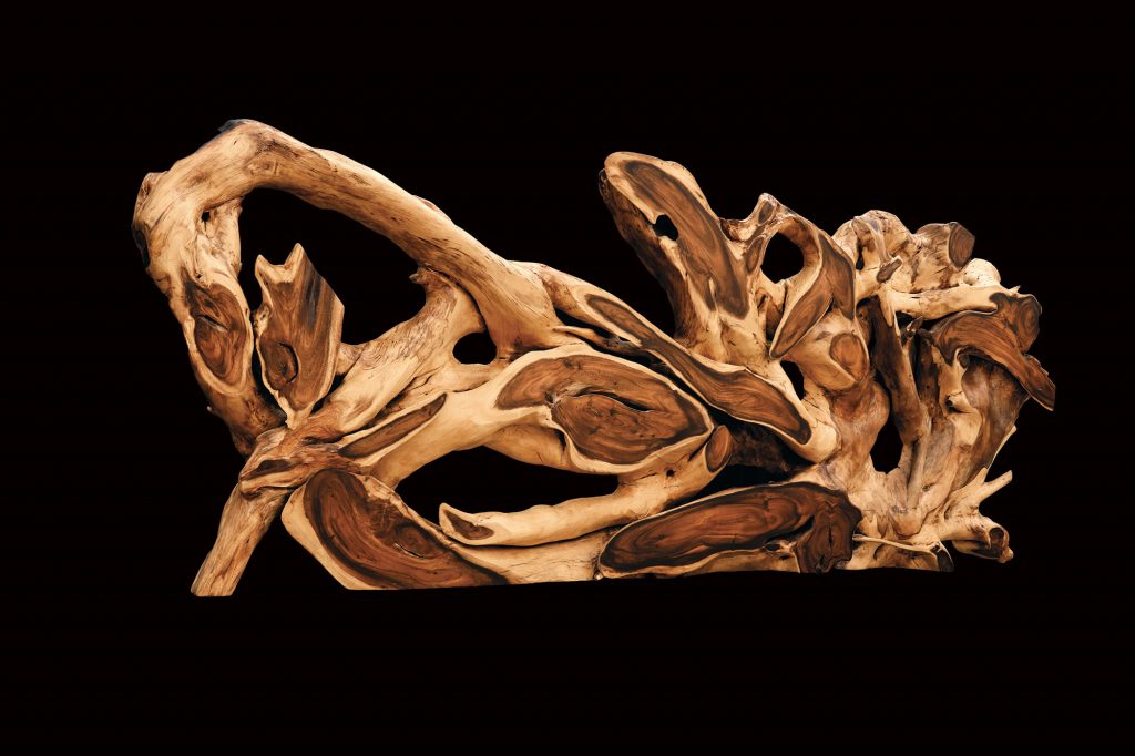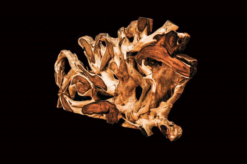 Für diese luxuriöse Trennwand verwendeten wir das Wurzelsystem der Akazie, das wir mit Schnitten in Form brachten. So entstand eine natürliche Struktur, in der sich Ansichten der hellen Rinde mit der dunkleren inneren Holzmaserung abwechseln – was ein völlig gegensätzliches Farbschema als bei unseren Gehölzen ist.