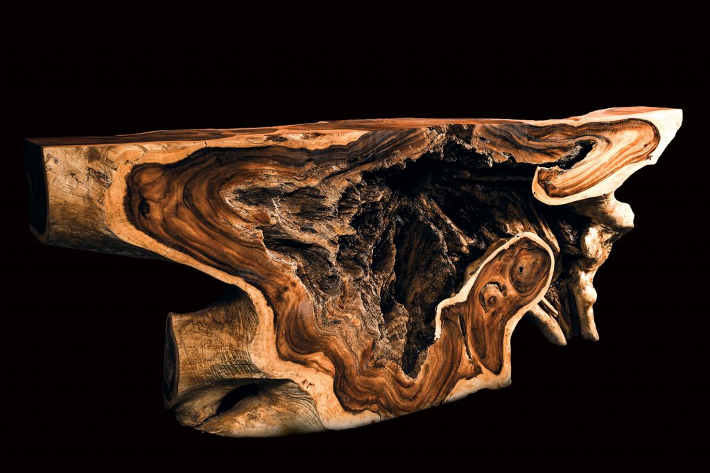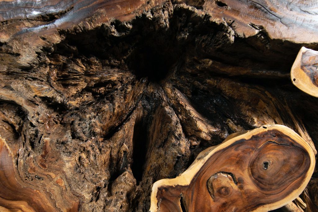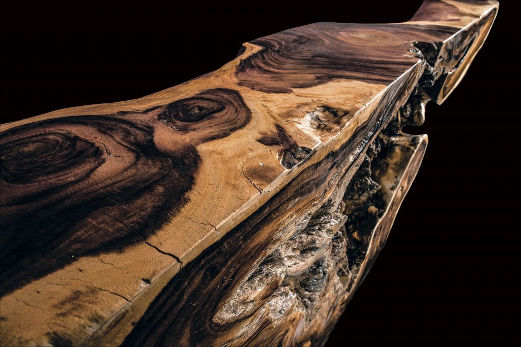 Der Nakhon Nayok Bartresen zeigt dank korrekt geführter Schnitte faszinierende Formen und Strukturen im Akazienstamm. Die zentrale Ansicht in den Stamm macht diese Theke zu einem unverwechselbaren Original, das zum dominierenden Merkmal Ihres Interieurs wird.