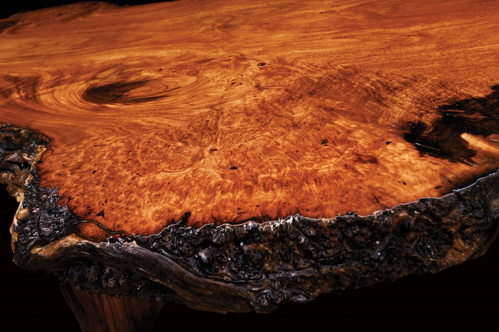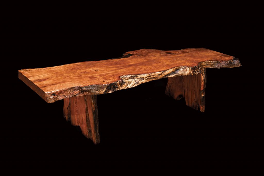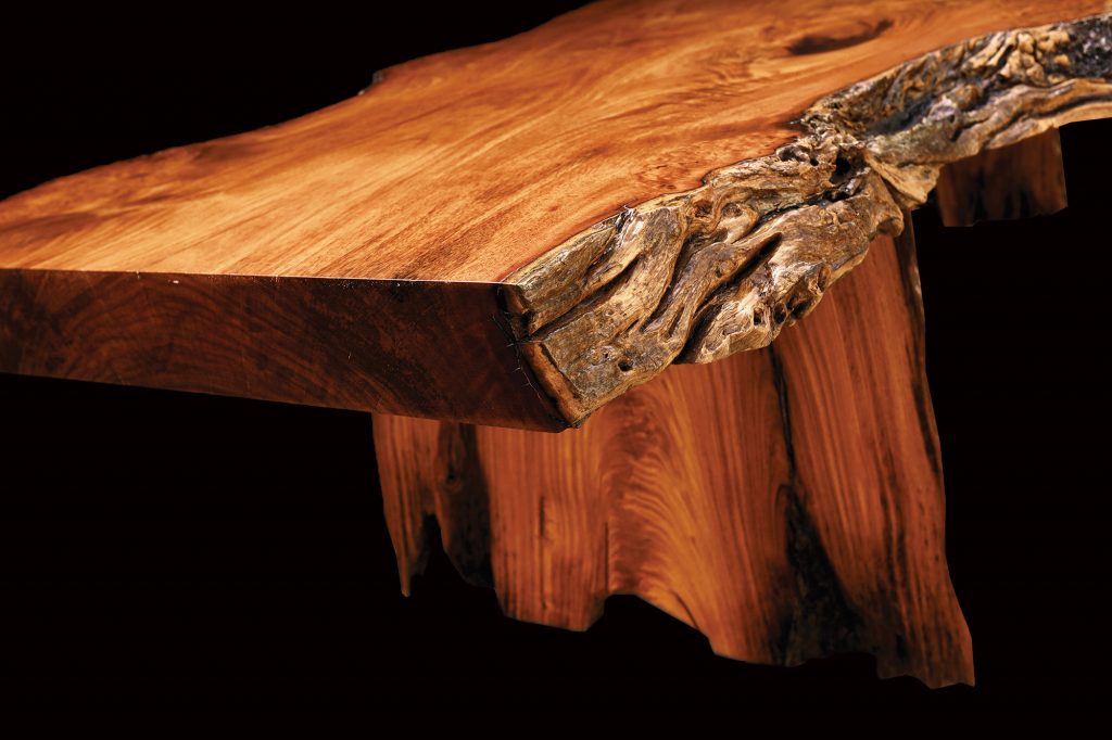 Dominantes Möbelstück. Obere Platte aus Mahagoni und längere Kante mit natürlicher Rinde und Holzmaserung auf beiden Seiten. Die Tischbeine sind ebenfalls aus massivem Mahagoni. Dank der großen Fläche praktisch und gleichzeitig eindrucksvoll.