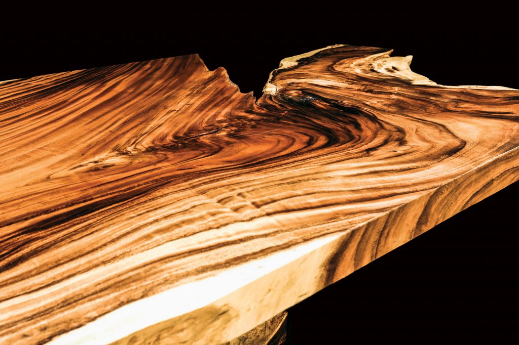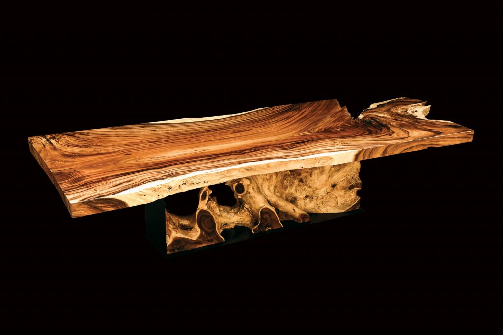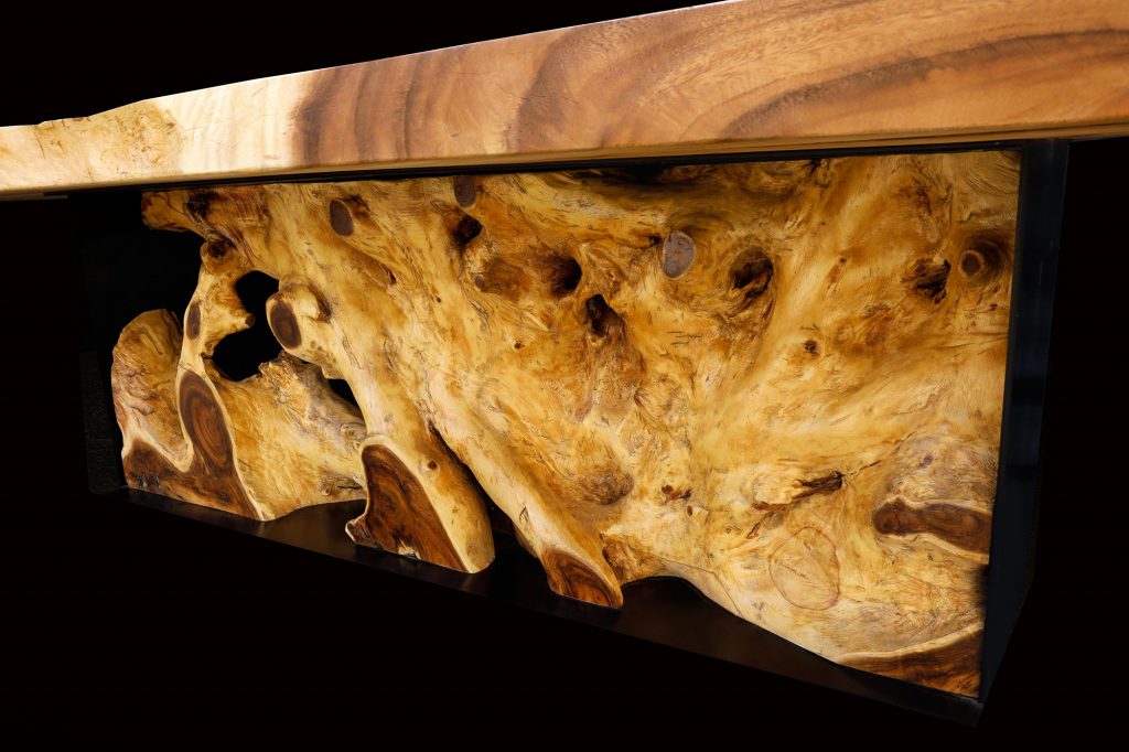 Sehr effektvoller Esstisch. Die einfache massive Grundfläche aus der gleichen Holzart unterstreicht seine Wirkung. Die Unregelmäßigkeit  der Tischplatte zieht wieder und wieder die Aufmerksamkeit auf sich. Oberflächengestaltung matter Lack.