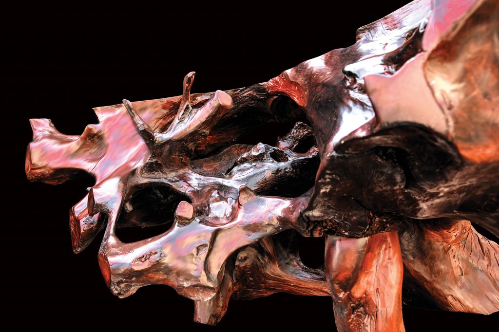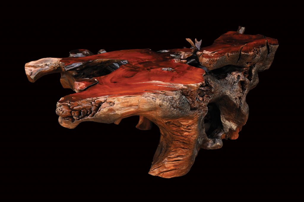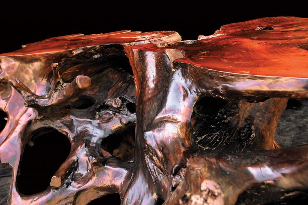 Tisch mit unwiederholbarer Form und Charakter. Eindrucksvolles Mahagoniholz mit satter Farbe. Die polierten und lackierten Schnitte bilden einen schönen Kontrast zu den übrigen natürlich gekräuselten Oberflächen.