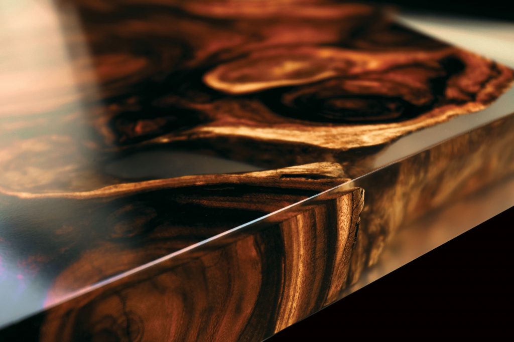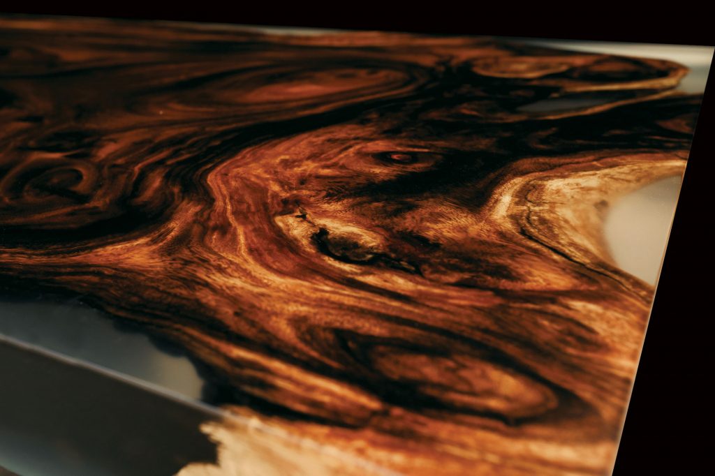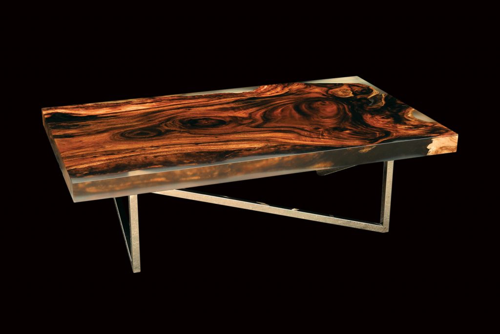 Die Grundplatte aus Akazienholz mit dramatischer Maserung wurde mit Epoxidharz zu einer rechtwinkligen Form ausgefüllt und auf Hochglanz poliert. Die dramatische Maserung des Holzes entsteht dadurch, dass der Baum in nassem und schlammigem Gelände wuchs. Die Metallbeine bilden einen geeigneten Kontrast zu den natürlichen Materialien.