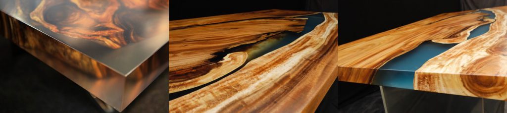 Die von Ihnen gewählte Platte kann natürlich gebildete Risse enthalten, aber Sie haben die Wahl, ob Sie diese bewahren wollen oder nicht. Sie können mit Epoxidharz ausgefüllt werden und so entsteht eine glatte Tischfläche und ein völlig neues Aussehen. Das Harz kann klar sein oder in einer beliebigen Farbe, die Sie wählen können. Der Preis des Harzes hängt von der verbrauchten Menge ab.